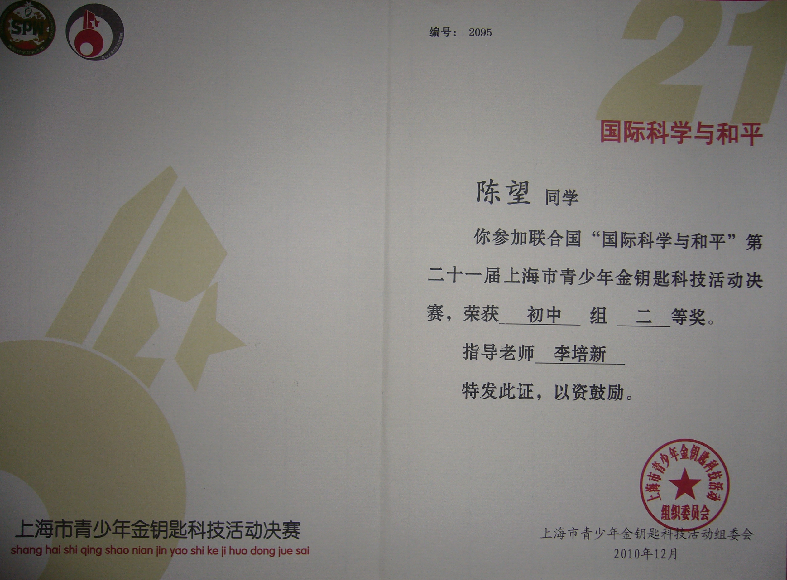 热烈祝贺我校九(6)班陈望同学,在12月11日南洋初级中学举行的第二十一届“国际科学与和平周”上海市青少年金钥匙科技决赛活动中,荣获上海市初中组二等奖,同时荣获徐汇区初中组第一名(徐汇区一等奖空缺)。1988年12月,第43届联合国大会通过决议,将每年11月11日这一周定为“国际科学与和平周”。要求各国举办相应活动,宣传科技进步对维护世界和平、促进人类社会发展所起的重要作用。目前有134个国家积极参与。中国活动的主办单位是中国科协、中科院、教育部、团中央、中国工程院等42个单位。全国每年举办的各项活动中,全国中小学生“金钥匙”科技竞赛是重点保留项目。。(注:“金钥匙” 科技竞赛和“明日科技之星”奖项是中学生科技竞赛项目级别最高的两个奖项,按市教委有关规定,获一等奖学生拥有高考加20分资格。)附长桥中学以及徐汇区获奖名单: